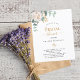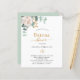 Een witte achtergrond. Gedecormeerd met witte bloem, bloem (pony) en groene waterkleurige eucalyptusbladeren, kruiden, groen en een nepgoudbolg. Pas de naam van de bruid aan om te zijn en partijdetails aan te passen en voeg deze toe. Zwarte en gouden letters. Achterzijde: groene achtergrondkleur.
