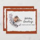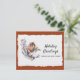 Een schattige roest en een grijze winterroodrover zit op een tak van witte en groene bladeren tegen een sneeuwwitte, gedecikkelde randpapierachtergrond. Het ontwerp zelf is voorzien van een warme roestkleur die wordt getrokken uit de eigen veren van de vogel. In de voorbeeldtekst voor onze begroting staat op de nieuwe kerstkaart: "Vakantiegisters van ons nieuwe huis". Deze tekst en alle tekst op de achterzijde van de kaart kunnen eenvoudig worden herzien - of met de hand worden verwijderd - via de personaliseringssjabloon.