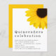 Gele zonnebloem Quinceañera Een budgetvriendelijk KLEINER 4,5 x 5,6 inch alternatief. Verkrijgbaar in een SEMI GLOSS 110 lb KAART STOCK of een SATIN FINISH 80 lb THINER PAPER STOCK. Enveloppen zijn een optionele extra. Informele stijl. Een gigantische zonnebloem is rechtsboven en de kop is groot hieronder met de details aan de onderkant. Pas de tekst eenvoudig aan uw eigen details aan.