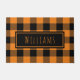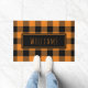 Welkom uw familie en vrienden deze herfst met deze aangepaste naam doormat in een roestachtig oranje en zwart gebuffel. Pas het aan met uw familienaam of een woord van uw keuze in een midden paneel in een modern oranje letterwoord op zwart met een oranje rand. Geweldig voor het hele herfstseizoen van Halloween tot Thanksgiving. Ontworpen door © Tim Coffey.