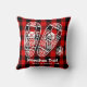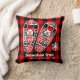 Een knus werpkussen met witte sneeuwschoenen, een sneeuwvlok en de woorden "Snowshoe Trail Next 4 Miles" op een rode en zwarte geplakte achtergrond van buffels. Het perfecte accentkussen voor uw rustieke kamp of hut!
