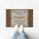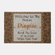 Een grappig, grappig, welkom mat in oranje roest en bruine tinten om bij uw toegangsdeuren te plaatsen. Geweldige kleuren voor herfst en herfst! Welkom in het huis (voeg Jouw naam toe), Buig de knie of veeg je voeten tenminste af. Een deuropening die geschikt is voor royalty's, Buig de kniedeur