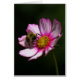 Bumblebee staat op een roze kosmos-maisiebloem met een groene achtergrond.