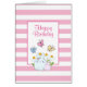 Een gelukkige verjaardagskaart met een roze en witte gestreepte achtergrond. Een wit lijst met een roze grens die over bovenkant met uw Happy Birthday tekst binnen wordt gelaagd. In het lijst een afbeelding van een moeder en een baby bunny die samen staan. Gele daisies op de achtergrond. Whimsische vlinders fluiten over. Binnen de kaart bevindt zich uw persoonlijke bericht en naam (namen). Verdroogd met een bundelbanner en een stuk verjaardagstaart.