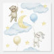 Waterverf konijntje en teddybeer zweven elk met een blauw-gele ballon door de wolken met de maan en de sterren naar de lucht voor babyjongen kwekerij