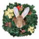 Fawn Flemish Giant bunny konijntje kijkt door een grote foto die acryl is afgesneden met kerstversiering en die is voorzien van een rood lintje stropdas