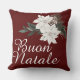 Dit vakantie thema kussen heeft een Italiaans kerstthema met waterverf bloemen op een bordeaux of donkerrood gekleurde achtergrond. De uitdrukking Buon Natale, die in Italië wordt vertaald als "Vrolijk kerstfeest", is in een elegant lettertype afgedrukt op het onderste gedeelte. Een winterbloemboeket van witte poinsettias, pijnboomtakken, een dennenappel en winterblad is afgebeeld boven de buon natale begroeting.