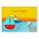 Bon Voyage, Good Trip, Buon Viaggio!, papieren wenskaart geschreven in het Italiaans / Italiaans. Een zonsondergang met een zeilboot, sleepboot, vis, golven en pelikanen op de pier. Stuur ze naar de zonsondergang met deze heldere en leuke kaart. Leeg van binnen voor je persoonlijke boodschap.