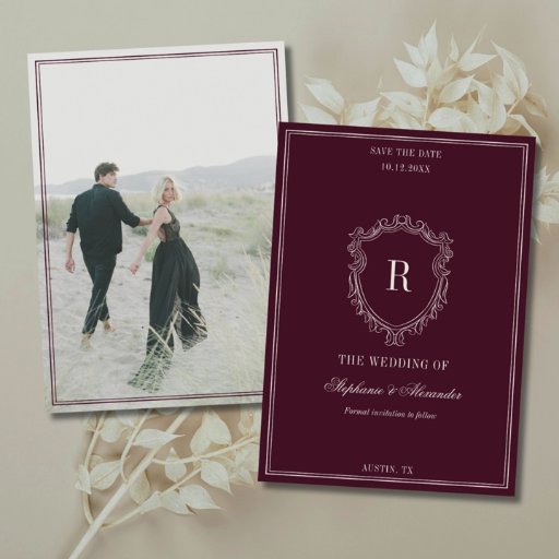 Set against a soft ivory background, the rich burgundy monogram crest serves as the focal point, symbolizing legacy, romance, and enduring style. Elegant script lettering paired with classic typography creates a beautifully balanced composition that feels formal and elevated without appearing ornate. The clean, structured layout allows the crest to stand out as a statement detail while remaining seamlessly integrated into classic tablescapes.