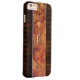 De handige iPhone 6 van het Deco van de Kunst stijl plus hoesje, met grafiek van een burl houtkorrel die onderaan het midden van het hoesje loopt. Een bruin op bruin getextureerd uitziend stripe patroon, aan beide zijden van het hoesje, heeft een zilveren toonband als grens. Pas het monogram met één letter aan, in het midden van het hoesje, om aan uw behoeften te voldoen. Geweldig cadeauidee voor hem.