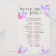 Zou ze liever Butterfly Baby shower spelkaart met bewerkbare bewoordingen willen gebruiken? Het ontwerp heeft een rand van vlinders in roze lila en blauw met zilvergrijze confetti. Als u van passende producten zou willen, te doorbladeren gelieve mijn collectie van de Vaardigheden Butterfly of me te berichten om de ontwerpsjablonen toe te voegen u wenst.