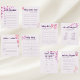 Onderdeel van het Butterfly Kisses collectie, dit Baby Bingo spel is de perfecte manier om uw gasten te vermaken tijdens de opening van het geschenk! Je kunt de bingoregels bepalen: diagonalen, vier hoeken, etc. Laat uw gasten gewoon de pleinen vullen met geschenken die ze verwachten, en laat ze markeren als de eregast(en) open en kondig aan! Alle tekst is aanpasbaar om perfect aan te sluiten bij de details van uw gelegenheid ↣ klik gewoon op de knop 'Personaliseren'. Mix met andere spellen binnen het collectie voor een volledige dag plezier!