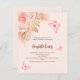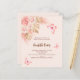 Voor een modern boho stijl Vrijgezellenfeest. Een perzik achtergrond. Versierd met roos gouden en roze bloemstukken, rozen, pampasgras en vlinders. Personaliseer en voeg een naam en feestdetails toe. Achterkant: perzikkleurige achtergrond en een vlinder. 1 vel = 1 uitnodiging afgedrukt rand tot rand.