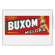 Etiket voor fruitkratten voor Buxom Brand Melons uit Yuma, Arizona.