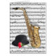 Digitaal design. Saxophone en bowler pet met roos op een achtergrond van een muziekvel. Geïnspireerd door mijn liefde voor Jazz muziek. Een schat voor elke Jazz-fan. Ontworpen als lege open kaart om je eigen bericht toe te voegen.