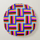 Een gedurfd, contrastrijk geometrisch patroon dat is opgebouwd uit herhaald gestreept rond kussen in levendige tinten van rood, geel, magenta, sinaasappel en zwart. Elk blok wisselt af tussen horizontale en verticale strepen, omlijst door sterke blauwe randen tegen een hemelsblauwe achtergrond. De lay-out creëer een geweven, bijna optisch-illusie effect, alsof het patroon in elkaar grijpt in een ritmische dans van kleur en orde. Het is speels, luid en onmogelijk om te negeren.