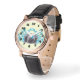 Een horloge met een schattige waterverf voor pendombugs. Een zwarte camera omgeven door azuurblauwe bladeren en vlinders in een decoratieve inrichting. De grote gedurfde klokgetallen in het zwart maken dit horloge gemakkelijk te lezen. Reeks op een crèmekleurige achtergrond.