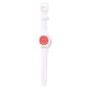 Polshorloge in reflecterende roze draaiende vormen op een basiskleur van rood.