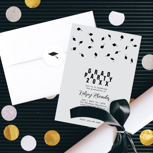 The front features a festive scatter of graduation cap confetti with a modern typography layout pairing a bold condensed sans serif font with a casual script. On the back, a photo of the graduate is showcased along with space to include their name, school, degree, and class year or a little something about what the grad will be up to next.