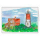 Een blanco kaart met Nauset Lighthouse op Cape Cod, Massachusetts met een fel rood dak en rondlopende paarse wilde bloemen geïllustreerd met inkt en waterverf.