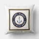 Gepersonaliseerde kapitein met jouw naam en bootnaam nautisch anker logo vierkant kussen. Klassiek cirkelembleem met anker- en tekstvelden binnen een buitenste vierkante rand in marineblauw, wit en goud op een witte achtergrond.