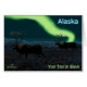 Twee gekruiste stieren caribou (Rangifer tarandus), ook bekend als rendieren, lopen 's nachts de toendra terwijl ze naar het zuiden migreren voor de winter. De vorst ligt op de grond en de noordelijke lichten gloeien boven de verre bergen. De tekst die "Alaska"leest verschijnt in het gloeien blauw en wit voegt uw eigen extra tekst toe.
