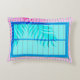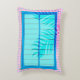 Eyecatching pastelroze en blauw omkeerbaar kussen waarop de houten venstersluiters van een caraïbische strandkamer in de schaduw van nabijgelegen palmbomen zijn afgebeeld