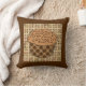 Cupcake met karamelglazuur bedekt met chocoladesproeiers, in een decoratief, chocoladebruin en bruin, polka dot cupcake-wikkel, op een lichtbruin en beige batik patterend achtergrondwerpkussen