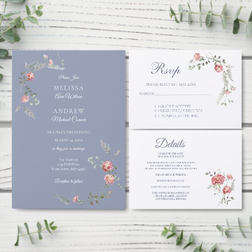 Timeless, romantic, and beautifully refined, the Carnation and blue Wedding Invitation Suite brings a fresh twist to a classic wedding tradition. Delicate blue florals bloom across each piece, creating an elegant canvas that perfectly complements weddings of any season.