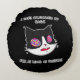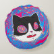 Een rond kussen met de kat op een zwarte achtergrond en tekst aan de ene kant, en alleen de exploderende kattenkop met een kleurrijke achtergrond aan de andere kant. De smoking kat heeft een aanval van geweld na te veel buikkrabben. Bewonder de gekke ogen zelf, of geef het aan een speciaal persoon die van katten en ook zoomies houdt. Pas op! Het rolt weg!