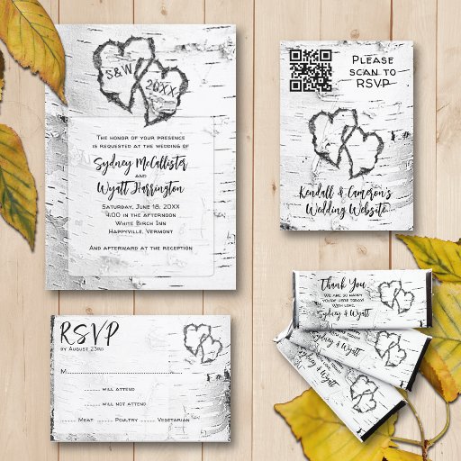 White birch wedding invitation template. Text is at the bottom with an image of two hearts carved into the “wood” above. For a casual, rustic wedding, this template has three places for printed black text with names in bold lettering. The reverse also contains a realistic birch bark image.