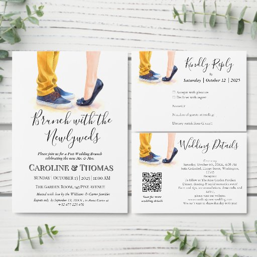 Deel uw blijde nieuws in stijl met deze casual waterverf huwelijksaankondiging. Met een speelse illustratie van de schoenen van het paar en een elegante moderne kalligrafie, is dit ontwerp zowel ontspannen als romantisch. De zachte waterverf-details creëer een luchtige sfeer, terwijl de lettertypen de boodschap helder en tijdloos houden. Perfect voor koppels die een leuke, eigentijdse manier willen om hun huwelijk aan te kondigen. Volledig aanpasbaar - bewerk namen, datum en tekst om bij uw feest te passen.