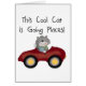 Een kat in een rode auto en tekst met de tekst "This Cool Cat is Going Places!" op kattenontwerp t-shirts, mokken, kaarten, stickers, canvas tassen, sleutelhangers en andere items.