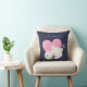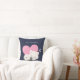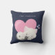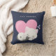 Een kussen met een schattige grafische illustratie. Een witte pootkat met een schattig pootdruk afbeelding op haar vacht. Vreemd slapen. Een groot roze hart achter haar en ook een paar kleine sterren. De tekst luidt: Kat Persoon. Donkerblauwe achtergrond.