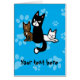 Een aanpasbare sjabloon met een wenskaart met drie cartoon katten. Eén tabby, één zwart en één wit op een levendige blauwe achtergrond met lichtere blauwe afdrukken.