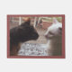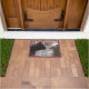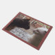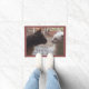 Het zoete ontwerp op deze deurmat is een originele foto van twee katten die elkaar begroeten in een deuropening. Een van de katten is een calico, met zwarte, oranje en witte gemengde kleuren en een oranje oorpunt. De andere kat heeft een witte vacht, blauwe ogen en een roze neus. Via een schermdeur kunnen we een welkomstmat op het houten dek zien, met het woord "WELKOM" naar buiten gericht vanaf de deuropening. Een terracotta plantenbak met greens en wat witte meubels completeren de achtergrond.