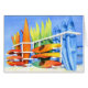 Heldere, kleurrijke kayaks die in witte houten racks op het strand zijn geperst. :: Oorspronkelijke Waterverf van Barbara Bayer