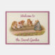 Vier tuinbouwers maken gebruik van harken en vijgen, terwijl ze de neiging hebben om hun groentetuin te gebruiken, van een schilderij van Beatrix Potter in de waterverf. Personaliseer met een welkomend bericht aan gasten in uw "geheime tuin"of adres van de huisstraat met manuscript dat in roos rood met een passende grens wordt geknipt.