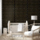 Dit zelfklevende wandpapier voor uw muren en ambachtelijke behoeften heeft een hemelthema met rijen van getextureerde gouden sterren op een zwarte achtergrond.