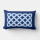 Lumbarkussen in een Keltisch, rechthoekig, ononderbroken knoop patroon, symboliserend heilige meetkunde en de verbondenheid van al het leven in het universum - wit patroon geschetst in turquoise op een donkerkblauwe achtergrond