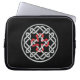 Een Keltische Knot Red Metallic-laptophoes met een Keltische knoop met een rood vierkant kruis in het midden.