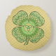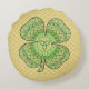 Deze klassieke vierbladklaver bedekt een concentrische cirkelvormig ontwerp met lagen Keltische weven in meerdere groene tinten met een beetje sinaasappel voor accent.