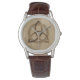 Een Mannen Classic Brown Leap Watch met een eenvoudige kleurige Keltische triquetra, dooreengesneden met een cirkel die een trinitair symbool vormt tegen een hout dat een spirituele eenheid vormt met het goddelijke.