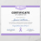 Een modern certificaat van voltooiing voor kankerpatiënten die de behandeling met bestralingstherapie voltooien. Het ontwerp heeft een lavendelkleurenschema om alle soorten kanker te vertegenwoordigen. Het lavendel lint kan indien gewenst worden gepersonaliseerd naar elke andere kleur. Alle tekstelementen zijn gecentreerd en laten voldoende ruimte aan de linker- en rechterkant voor persoonlijke handtekeningen en berichten van oncologieverpleegkundigen en artsen.