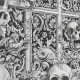 Druk uw Gothic esthetisch uit of versier voor Halloween met dit zwart-wit ontwerp geïnspireerd op de kaarsenhuizen van gotische kathedralen. Witte schedels net uit stenen nissen gesneden met wijnstokken.
