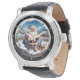 This vibrant watch face features a cheerful Santa Claus, giving a hearty thumbs-up in a picturesque snowy village. Cozy cottages with warm lights nestle among frosted pine trees, all set against a beautiful mountain backdrop under a bright sky. This artistic timepiece perfectly captures the joyous spirit of Christmas, making it a delightful decorative addition.