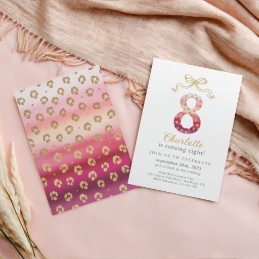Roze en gouden cheeta luipaard verjaardagsfeest Bedankt Ronde Sticker 8e verjaardagsuitnodiging met roze en gouden luipaard en cheeta Print Mooie en moderne 8e verjaardagsuitnodiging voor meisjes in roze en goud. De uitnodiging is voorzien van een prachtige faux gold boog met het nummer 8 in een luipaard / cheetah print in roze en faux goud. Hieronder is delicate grijswaarden schrijven voor de partij informatie. Op de achterkant een prachtige luipaard / cheetah dierenprint in tinten van roze en faux goud. Deze uitnodiging is perfect voor uw dochter, die een jonge dame aan het worden is. Als ze van roze houdt, is dit de perfecte uitnodiging voor haar feest!
