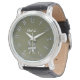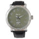 Chef's zilver gekruiste lepel en vork Kijk gezicht met het tonen van Arabische cijfers met uren en minuten. Lichtgetallen tegen olijfachtergrond. Trendy item voor mannelijke chef-koks. U kunt 1 veranderen. de tekst " Chef L" 2 . de achtergrondkleur