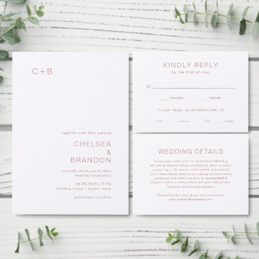 De moderne Uitnodiging van de Weddenschap met een eenvoudige en minimalistische lay-out met uw monogram in de hogere linkerhoek en uw trouwdetails in de bodem juiste hoek. Alle ontwerpelementen zijn in dusty roos roze en kunnen in het het ontwerpuitgeven hulpmiddel worden veranderd. Deze trouwuitnodiging met een minimaal, maar elegant ontwerp gaat goed met elke vorm van hedendaagse bruiloft.