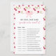 Add a sweet, playful touch to your baby shower with this cherry-themed He Said, She Said guessing game, featuring a soft pink background, cute cherries, and a dainty bow. Guests will love marking their answers as they try to guess who said each statement—Mom or Dad! This card pairs perfectly with cherry-themed décor, pink baby shower suites, or any feminine, whimsical celebration.